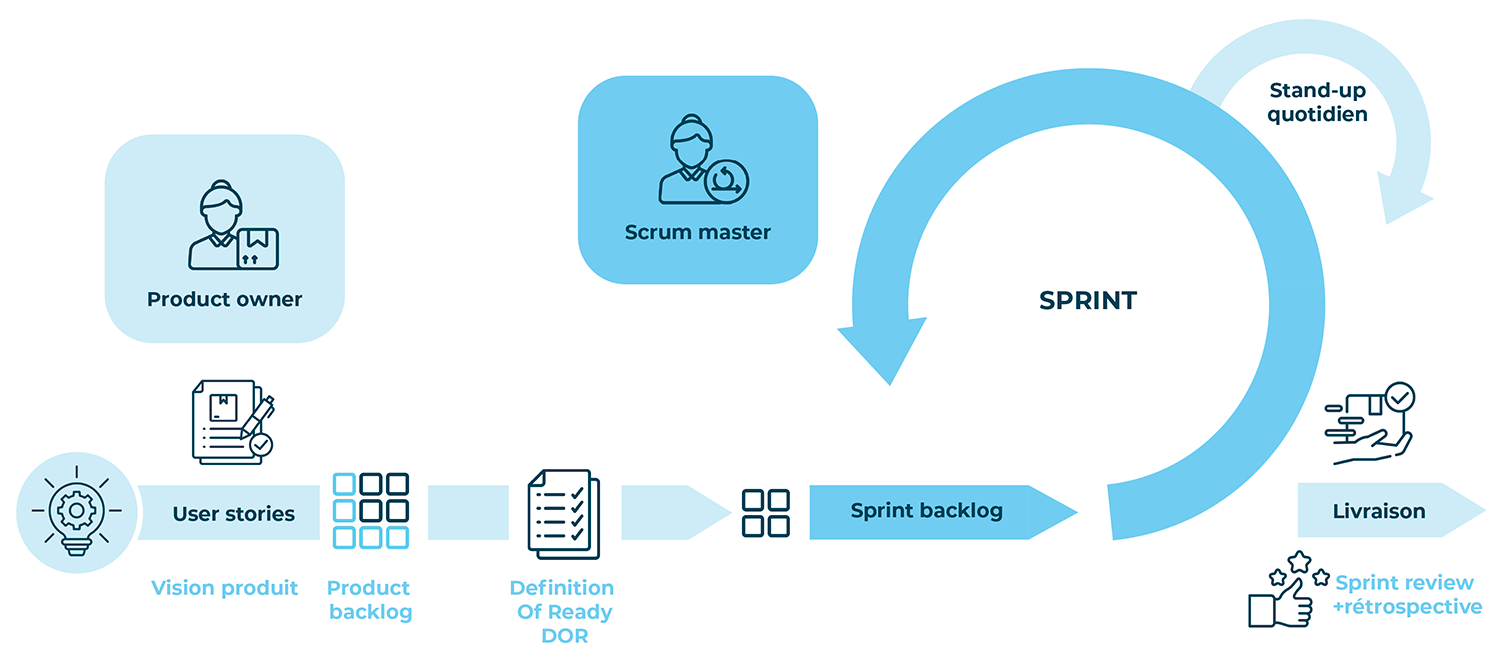 La livraison itérative en sprints permet des retours fréquents tout en prenant en compte un backlog produit actualisé.